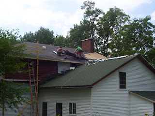 the guys are still up on the roof, but it's too dark to take pictures. the roof is tar-papered, drip-edged and chimney-flashed. both G and Dave are nailing down shingles as i type. G won the coin toss, and he has the air nailer, while Dave is putting down shingles the old fashioned way.